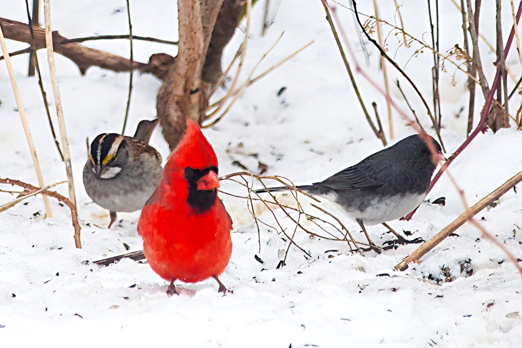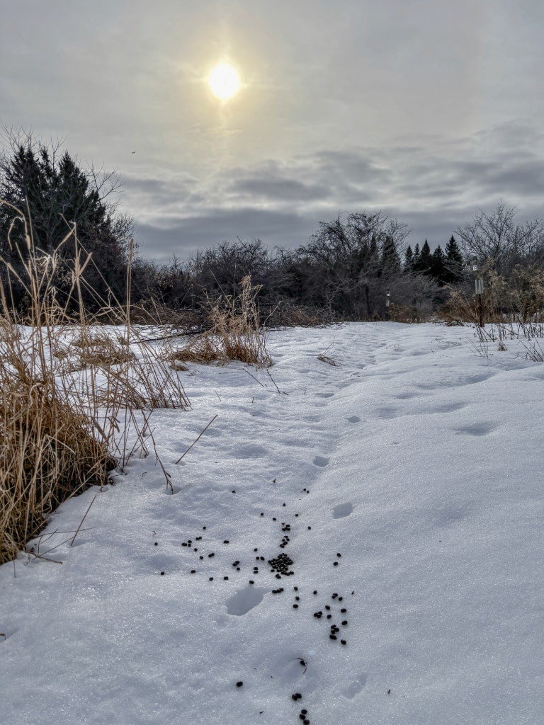 During the year to come you will see references to a bird banding research station just a few minutes drive from home. This is on land owned by McGill University and during the winter months, mid-November to the end of March usually, almost the only visitors it receives (the site is closed to the public) are my wife and I plus a couple of friends who strap on the snowshoes and go in to top up birds feeders and walk the trails to census the winter birds that might be found there. High quality walking and the whole site is ours and nobody else’s. Beautifully quiet with occasional overflying Ravens, Red-tailed Hawks and very occasionally a Northern Shrike perched on the top of a tree. Cold, but so worthwhile. This photograph is a corner of the research area taken on New Year’s Day 2025.