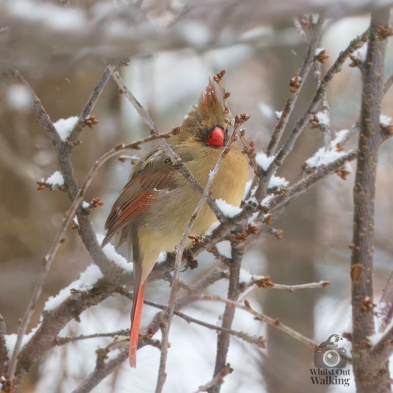 I am writing this from home on the western end of Montreal Island where winters can be pretty cold with lots of snow. In fact only two days ago a big storm came through and deposited the bast part of 2cm of freezing rain/ice which firmly put a stop to any thoughts of going out walking anywhere. Forecast for this first day of the new year is -19C with a windchill temperature of -27C. From the warm side of a window I caught sight of this female Northern Cardinal just in time to add to this post – while the bright red males might be the bird everyone notices, I have a liking for the more subtly coloured females.